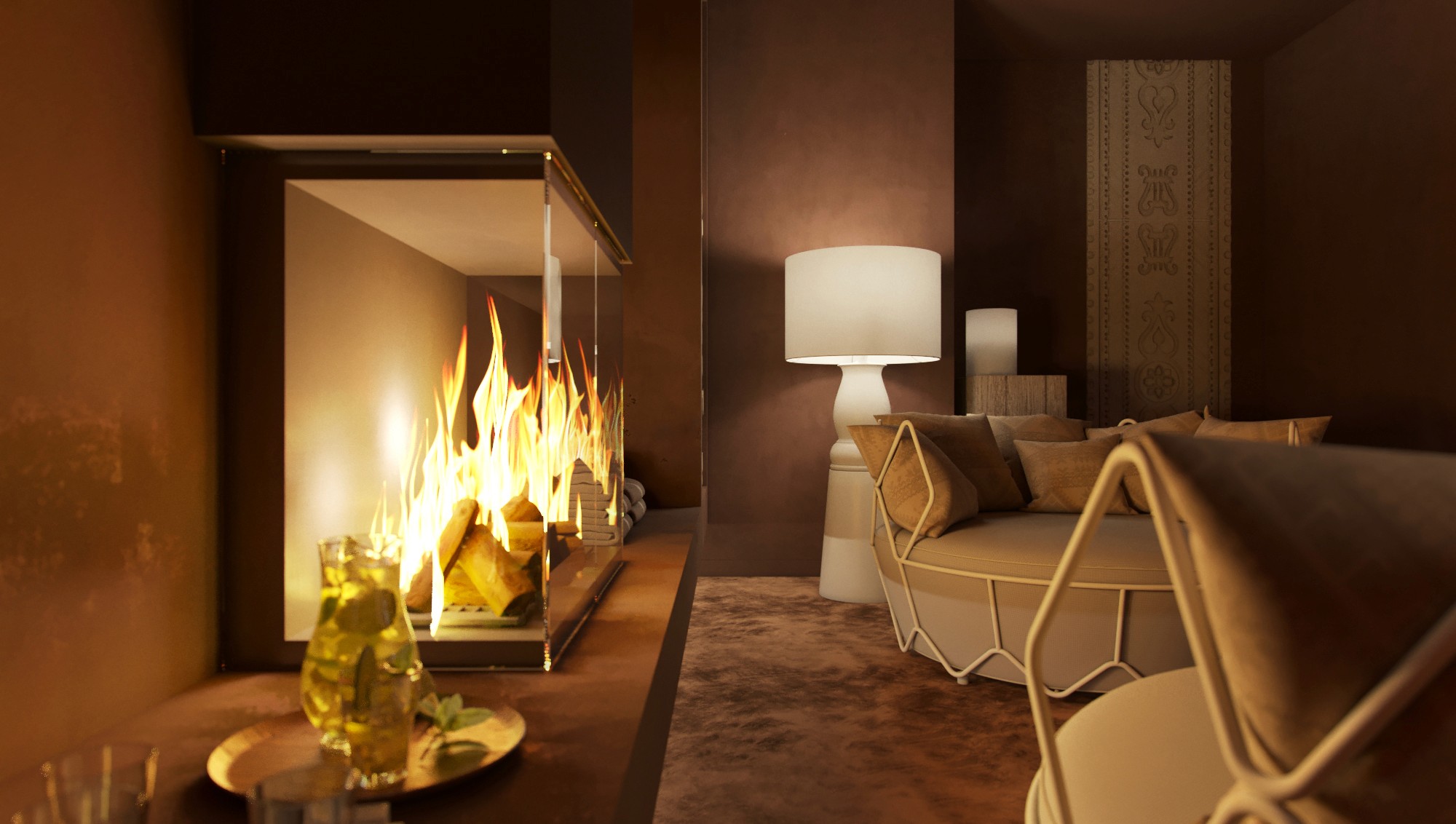 The contrast comes from what's at the other end. A dark, windowless relaxation room sits deep in the plan — deliberately cut off from the panoramic facade that dominates everywhere else. Soft surfaces, low light, a fireplace. During design, the client questioned it: the atmosphere read as ambiguous, not clearly wellness. Some visual elements were adjusted, but the principle — enclosure, darkness, warmth — stayed. It became the final point in the sequence. After the city, after the water, this is where the experience closes.