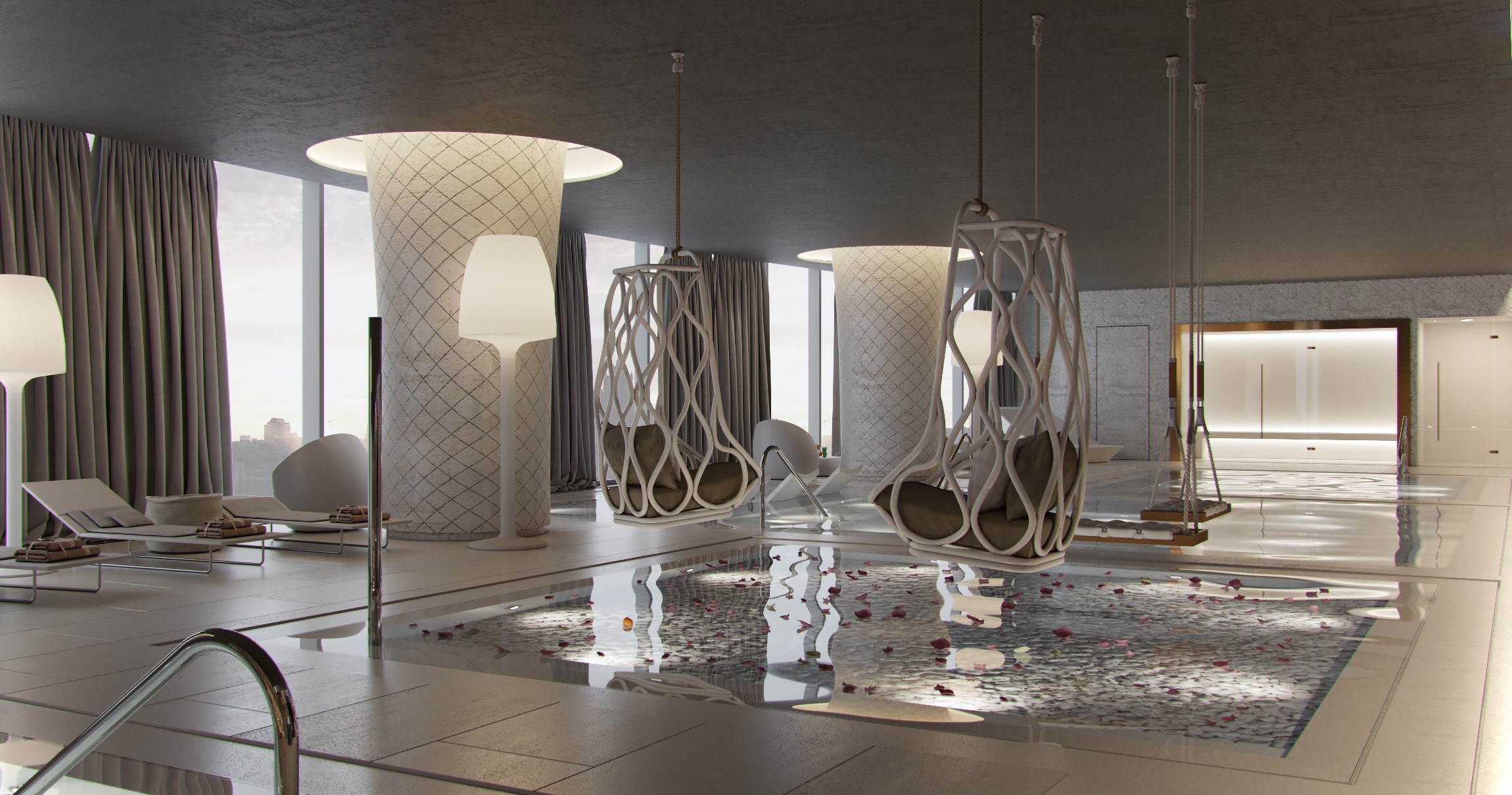 The entire perimeter is glass. For a hotel, this is an asset. For a spa, it introduces real friction: heat, exposure, condensation from warm water against a cold facade in winter. Rather than fighting it, the facade became the main stage. Water zones, rest areas, and viewpoints are positioned along it. Loungers sit directly in the pools, facing the city.