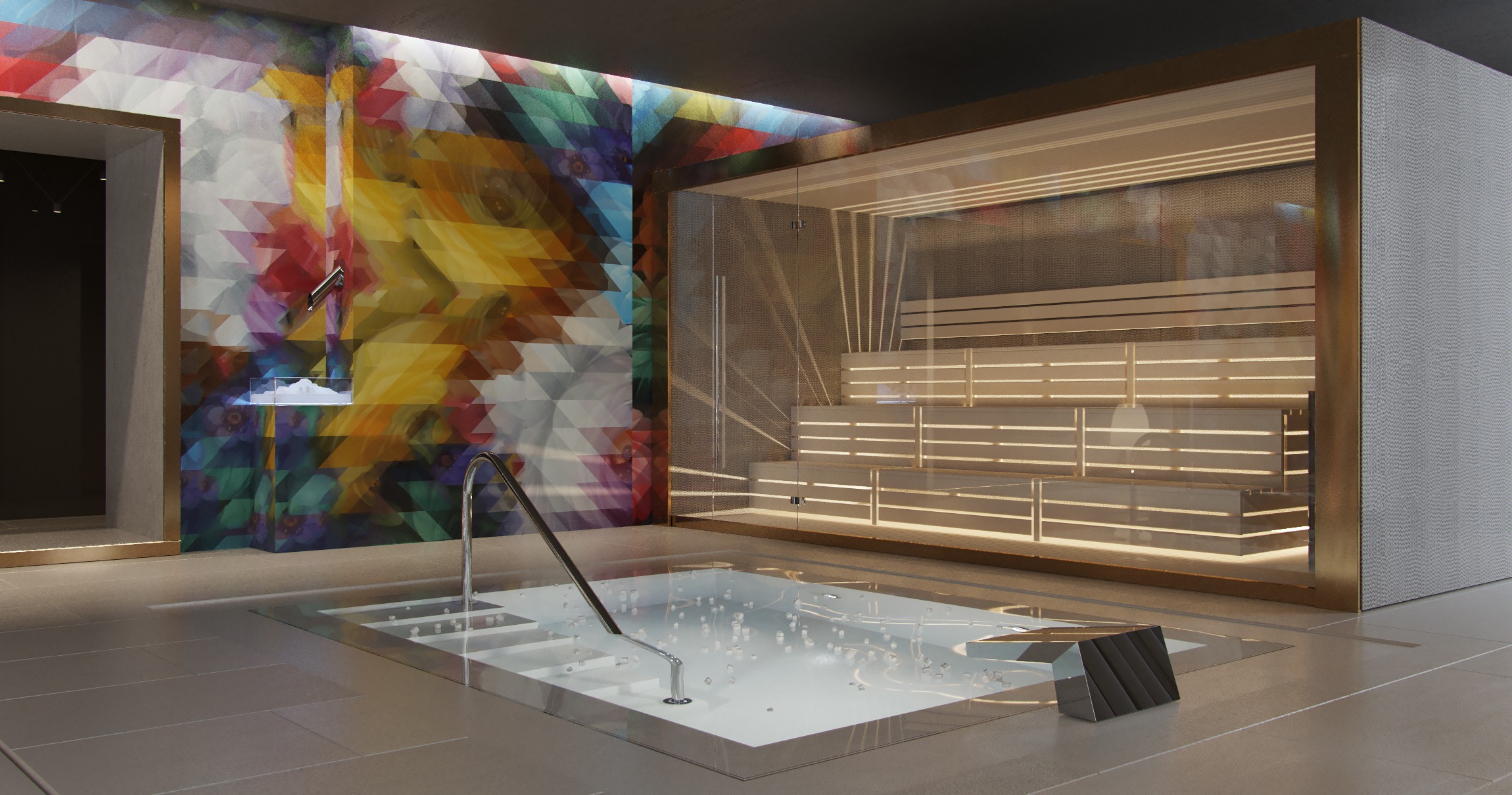 Instead of correcting the pool, we broke it. One basin became four — each with its own depth, temperature, and role: a floating salt pool for suspension, a hydrotherapy pool along the facade with submerged loungers facing the city, a shallow pebble pool with suspended cocoons above the water, and a cold plunge fed with ice as both ritual and contrast.
